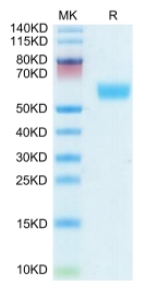 Molecular Mass : | The protein has a predicted MW of 37.7 kDa. Due to glycosylation, the protein migrates to 53-60 kDa based on Tris-Bis PAGE result. |