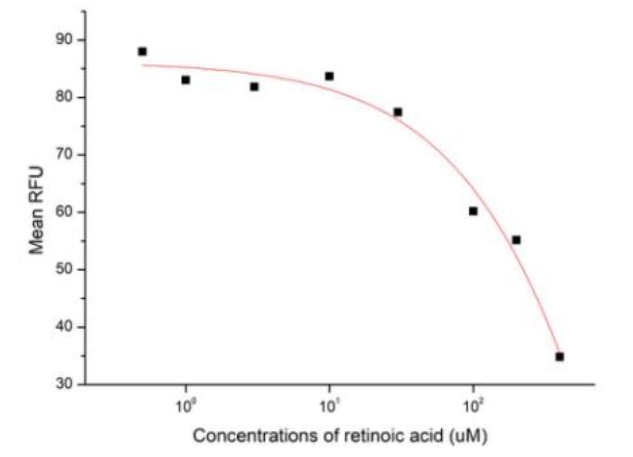 | Bio-activity : | Apolipoprotein M (APOM) is an approximately 25 kDa variably glycosylated protein that adopts a beta-barrel structure characteristic of lipocalin family proteins. It functions as a component of lipoprotein particles which play essential roles in fatty acid and cholesterol transport and metabolism. Alternative splicing generates a short isoform that lacks the N-terminal 72 amino acids. APOM is produced primarily by hepatocytes but also by renal tubule epithelial cells. The signal peptide is not cleaved and is required for APOM association with lipoprotein particles as well as Megalin mediated reabsorption by the kidney. The activity of recombinant mouse APOM was measured by its ability to bind all-trans retinoic acid. The binding of retinoic acid results in the quenching of Trp fluorescence in APOM. APOM was diluted to 50 ug/ml in 50 mM Tris, 10 mM CaCl2, 150 mM NaCl, pH 7.5 (assay buffer) and the retinoic acid was diluted to 400, 200, 100, 30, 10, 3, 1 and 0.5 μM in 95% ethanol. Mixing 112.5 μL of 50 μg/mL rmAPOM and 12.5 μL of retinoic acid serial dilutions in microtubes and a blank containing 112.5 μL of 50 μg/mL rmAPOM and 12.5 μL of 95% ethanol, then incubate at room temperature for 30 minutes. Loading 100 ul of the reaction mixtures and blank and read at excitation and emission wavelengths of 280 nm and 340 nm (top read), respectively, in endpoint mode. The result was shown in figure 1, the 50% binding concentration (BC50) is >300 μM. |