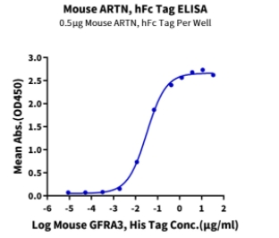 Immobilized Mouse ARTN, hFc Tag at 5ug/ml (100ul/well) on the plate. Dose response curve for Mouse GFRA3, His Tag with the EC50 of 32.2ng/ml determined by ELISA. |