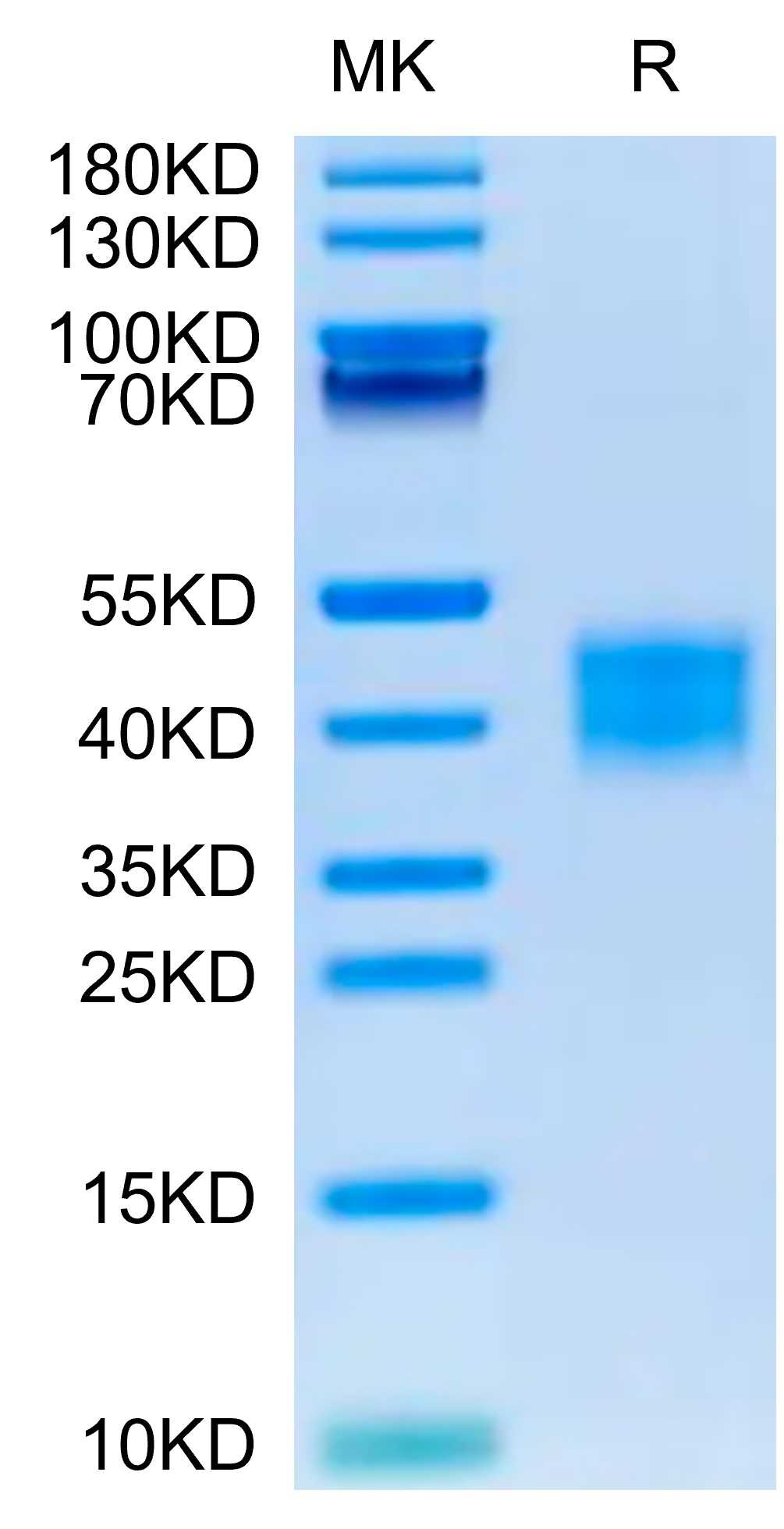 Molecular Mass : | The protein has a predicted MW of 26.89 kDa. Due to glycosylation, the protein migrates to 38-55 kDa based on Tris-Bis PAGE result. |