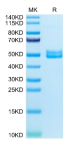 | Molecular Mass : | The protein has a predicted MW of 38.7 kDa. Due to glycosylation, the protein migrates to 48-60 kDa based on Tris-Bis PAGE result. |