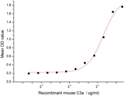 Complement Component 3a (C3a) is a component of the complement system, this protein is also known as the C3a anaphylatoxin, modulates inflammation and possesses antimicrobial activity. It's been identified that C3A can interact with Complement Factor I (CFI), thus a functional binding ELISA assay was conducted to detect the interaction of recombinant mouse C3a and recombinant human CFI. Briefly, C3a was diluted serially in PBS with 0.01% BSA (pH 7.4). Duplicate samples of 100 μl were then transferred to CFI-coated microtiter wells and incubated for 1h at 37°C. Wells were washed with PBST and incubated for 1h with anti-C3a pAb, then aspirated and washed 3 times. After incubation with HRP labelled secondary antibody for 1h at 37°C, wells were aspirated and washed 5 times. With the addition of substrate solution, wells were incubated 15-25 minutes at 37°C. Finally, add 50 µL stop solution to the wells and read at 450/630 nm immediately. The binding activity of recombinant human C3a and recombinant human CFI was shown, the EC50 for this effect is 0.77 ug/mL. |