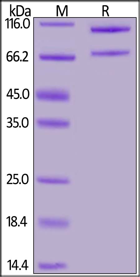| Molecular Mass : | This protein carries a polyhistidine tag at the C-terminus. The mature form of Complement C5 is a disulfide-linked heterodimer composed of proteolytically cleaved α and β chain. Each α and β chain has a calculated MW of 73.5 kDa (βchain) and 114.6 kDa (αchain). The protein migrates as 66 kDa (β chain) and 100 kDa (αchain) under reducing (R) condition (SDS-PAGE) due to glycosylation. |