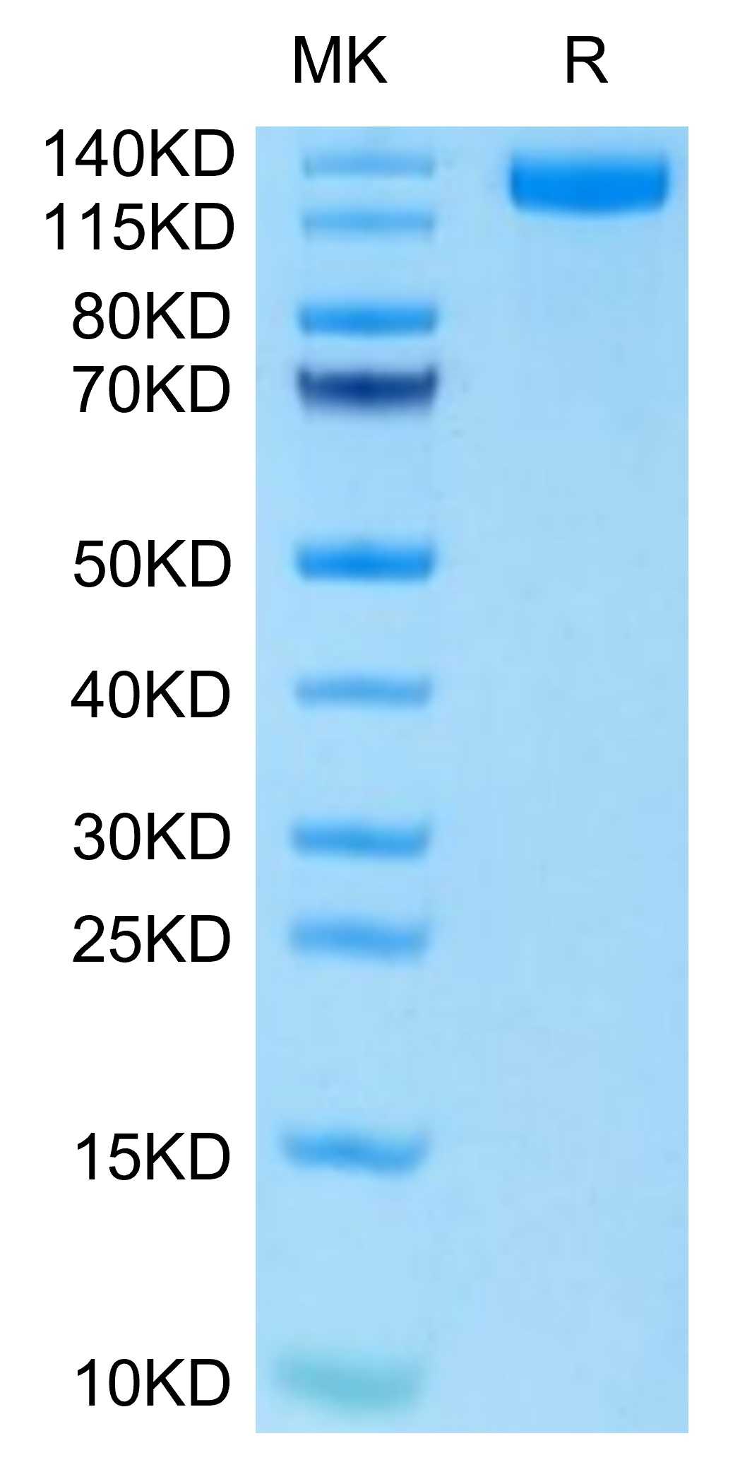 Molecular Mass : | The protein has a predicted MW of 109.53 kDa. Due to glycosylation, the protein migrates to 120-150 kDa based on Tris-Bis PAGE result. |