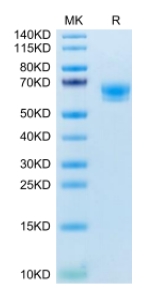 Molecular Mass : | The protein has a predicted MW of 44.5 kDa. Due to glycosylation, the protein migrates to 60-70 kDa based on Tris-Bis PAGE result. |