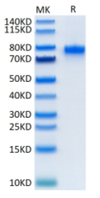 Molecular Mass : | The protein has a predicted MW of 75.6 kDa. Due to glycosylation, the protein migrates to 76-80 kDa based on Tris-Bis PAGE result. |