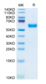 Molecular Mass : | The protein has a predicted MW of 39.1 kDa. Due to glycosylation, the protein migrates to 55-65 kDa based on Tris-Bis PAGE result. |