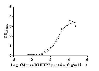 Measured by its binding ability in a functional ELISA. Immobilized Mouse CD93 at 2 μg/mL can bind Mouse IGFBP7, the EC50 is 373.4-836.8 ng/mL. |