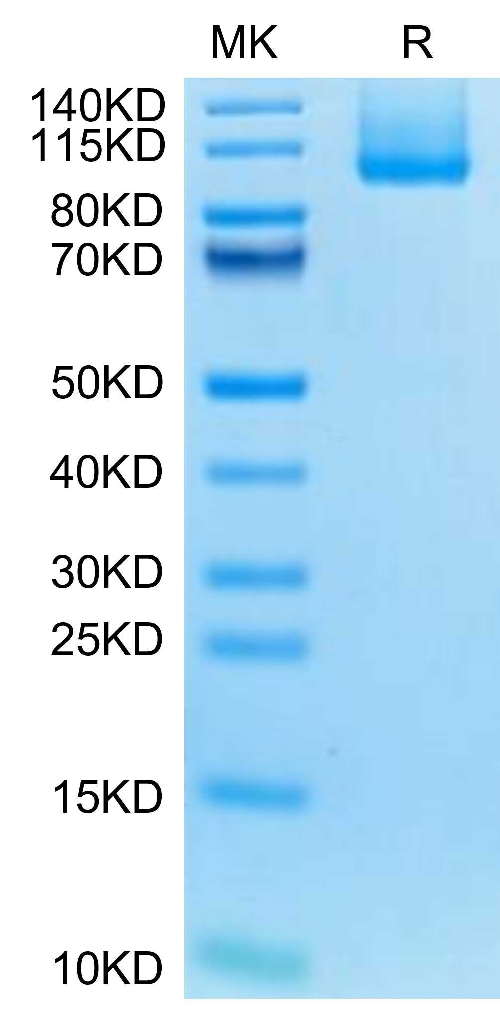 | Molecular Mass : | The protein has a predicted MW of 85.4 kDa. Due to glycosylation, the protein migrates to 90-150 kDa based on Tris-Bis PAGE result. |