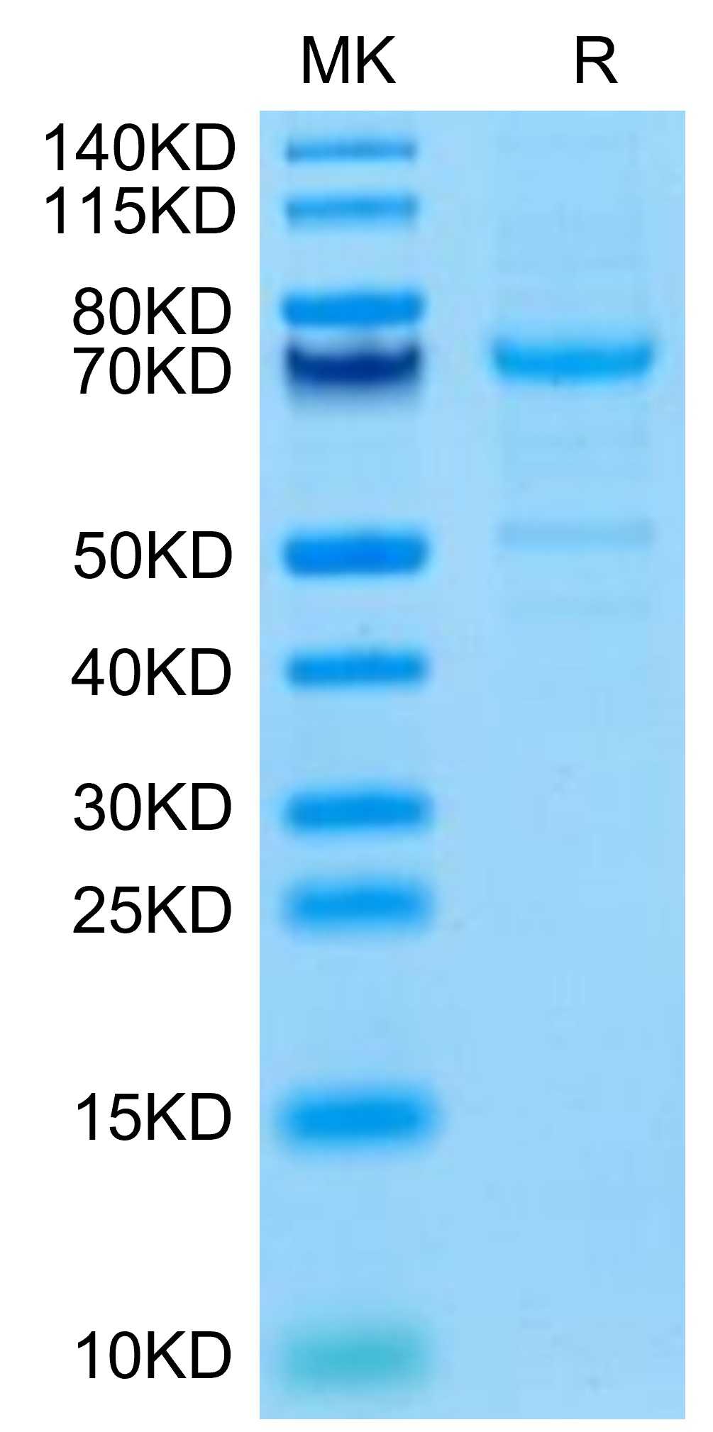 Molecular Mass : | The protein has a predicted MW of 64.68 kDa. Due to glycosylation, the protein migrates to 70-80 kDa based on Tris-Bis PAGE result. |