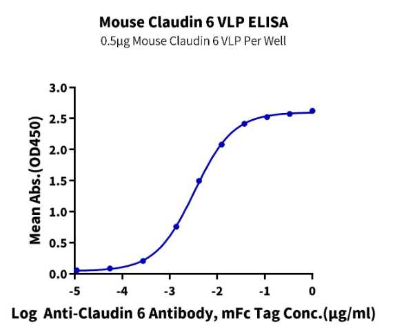 Immobilized Mouse Claudin 6 VLP at 5ug/ml (100ul/Well) on the plate. Dose response curve for Anti-Claudin6 Antibody, mFc Tag with the EC50 of 3.3ng/ml determined by ELISA. |