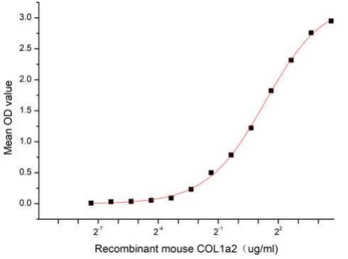 | Bio-activity : | Collagen Type I Alpha 2 (COL1a2) is a major component of collagen type I found in skin, bone, muscle, tendons, ligaments and other connective tissues.The COL1a2 protein is essential for the assembly, secretion, and stability of collagen fibers, which are vital for tissue development and repair.Mutations in COL1A2 are associated with a variety of genetic disorders, such as osteogenesis imperfecta (dysplasia of the bones) and cutis laxa. These diseases are often accompanied by weak bones and loss of skin elasticity. Besides, Fibrillin 1 (FBN1) has been identified as an interactor of COL1a2, thus a functional binding ELISA assay was conducted to detect the interaction of recombinant mouse COL1a2 and recombinant human FBN1. Briefly, COL1a2 was diluted serially in PBS with 0.01% BSA (pH 7.4). Duplicate samples of 100 μl were then transferred to FBN1-coated microtiter wells and incubated for 1h at 37°C. Wells were washed with PBST and incubated for 1h with anti-COL1a2 pAb, then aspirated and washed 3 times. After incubation with HRP labelled secondary antibody for 1h at 37°C, wells were aspirated and washed 5 times. With the addition of substrate solution, wells were incubated 15-25 minutes at 37°C. Finally, add 50 µL stop solution to the wells and read at 450/630 nm immediately. The binding activity of recombinant mouse COL1a2 and recombinant human FBN1 was shown, the EC50 for this effect is 2.53 ug/mL. |