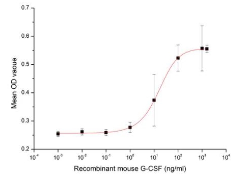 G-CSF is a pleiotropic cytokine best known for its specific effects on the proliferation, differentiation, and activation of hematopoietic cells of the neutrophilic granulocyte lineage. It is produced mainly by monocytes and macrophages upon activation by endotoxin, TNF-alpha and IFN-gamma. In addition, various carcinoma cell lines and myeloblastic leukemia cells can express G-CSF constitutively. In vitro, G-CSF stimulates growth, differentiation and functions of cells from the neutrophil lineage. Consistent with its in vitro functions, G-CSF has been found to play important roles in defense against infection, in inflammation and repair, and in the maintenance of steady state hematopoiesis. The activity of G-CSF is usually measured by a cell proliferation assay using M-NFS60 mouse myelogenous leukemia lymphoblast cells. M-NFS60 cells were seeded into triplicate wells of 96-well plates at a density of 8,000 cells/well with 2% serum standard 1640 which contains various concentrations of recombinant mouse G-CSF. After incubated for 3 days, cells were observed by inverted microscope and cell proliferation was measured by Cell Counting Kit-8 (CCK-8). Briefly, 10 µl of CCK-8 solution was added to each well of the plate, then the absorbance at 450 nm was measured using a microplate reader after incubating the plate for 2-4 hours at 37°C. Proliferation of M-NFS-60 cells after incubation with G-CSF for 3 days observed by inverted microscope was shown. Cell viability was assessed by CCK-8 (Cell Counting Kit-8 ) assay after incubation with recombinant mouse G-CSF for 3 days. It was obvious that G-CSF significantly increased cell viability of M-NFS-60 cells. The EC50 is 15.8-41 ng/ml. |