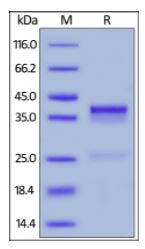Molecular Mass : | The protein has a calculated MW of 37.3 kDa. The protein migrates as 37-40 kDa under reducing (R) condition (SDS-PAGE) due to glycosylation. |