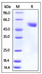 | Molecular Mass : | The protein has a calculated MW of 40.6 kDa. The protein migrates as 55 kDa under reducing (R) condition (SDS-PAGE) due to glycosylation. |