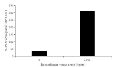Neutrophil-activating protein 3 (NAP3) also known as chemokine (C-X-C motif) ligand 1 (CXCL1) is a small cytokine belonging to the CXC chemokine family. NAP3 is expressed by macrophages, neutrophils and epithelial cells,and has neutrophil chemoattractant activity. Thus, chemotaxis assay used 24-well microchemotaxis system was undertaken to detect the chemotactic effect of NAP3 on THP-1 the human monocytic cell line. Briefly, THP-1 cells were seeded into the upper chambers (150 ul cell suspension,10^6 cells/ml in RPMI 1640 with FBS free) and different concentrations of recombinant mouse NAP3 diluted with serum free RPMI 1640 was added in lower chamber with a polycarbonate filter (8 um pore size) used to separate the two compartments. After incubation at 37°C with 5% CO2 for 1h, the filter was removed, then cells in low chamber were observed by inverted microscope at low magnification (×100) and the number of migrated cells were counted at high magnification(×400) randomly (five fields for each filter). Result shows recombinant mouse NAP3 is able to induce migration of THP-1 cells. The migrated THP-1 cells in low chamber at low magnification (×100) were shown. The optimum chemotaxis of NAP3 occurs at 0.001 ng/ml. |