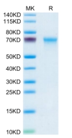 Molecular Mass : | The protein has a predicted MW of 45.9 kDa. Due to glycosylation, the protein migrates to 68-70 kDa based on Tris-Bis PAGE result. |