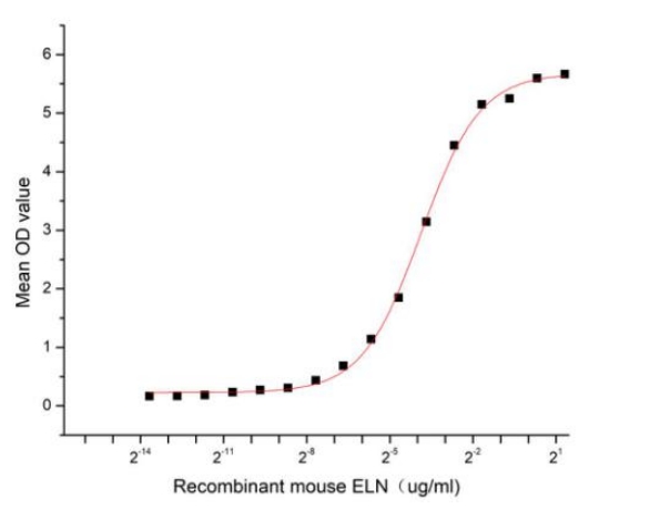 | Bio-activity : | Elastin (ELN) is an extracellular matrix (ECM) protein responsible for the extensibility and elastic recoil of many vertebrate tissues. ELN is abundant in elastic tissues, and tissues rich in elastin include the aorta and major blood vessels, the lungs, elastic ligaments, tendons and the skin. ELN can bind the elastin receptor complex and other receptors and stimulate migration and proliferation of monocytes and skin fibroblasts. Elastokines can also contribute to cancer progression. Deletions and mutations in this gene are associated with supravalvular aortic stenosis (SVAS), autosomal dominant cutis laxa. Decorin (DCN), an extracellular matrix (ECM) protein, is one of targets of ECM. Thus a functional binding ELISA assay was conducted to detect the interaction of recombinant mouse ELN and recombinant human DCN. Briefly, ELN was diluted serially in PBS with 0.01% BSA (pH 7.4). Duplicate samples of 100 μl were then transferred to DCN-coated microtiter wells and incubated for 1h at 37°C. Wells were washed with PBST and incubated for 1h with anti-ELN pAb, then aspirated and washed 3 times. After incubation with HRP labelled secondary antibody for 1h at 37°C, wells were aspirated and washed 5 times. With the addition of substrate solution, wells were incubated 15-25 minutes at 37°C. Finally, add 50 μL stop solution to the wells and read at 450/630 nm immediately. The EC50 for this effect is 0.068 ug/mL. |