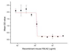 Fibulin 2 (FBLN2) is the second largest member of the seven-member fibulin family of extracellular membrane (ECM) glycoproteins. The protein is known to form disulfide-linked homodimers, but it can also be secreted as an oligomer. Fibulin 2 is considered a multifunctional binding protein due to its association with numerous ECM components, but its specific interactions have yet to be determined. Fibulin 2 is localized at the interface between microfibrils and the elastin core and its known interactions include nidogen-1, perlecan, laminin, aggrecan, endostatins, versican, collagen, and tropoelastin. It is down-regulated in numerous forms of cancer including breast, colorectal, lung, esophageal, and squamous cell carcinoma, but over-expression has been shown with solid tumors. To test the effect of FBLN2 on cell apoptosis, A549 cells were seeded into triplicate wells of 96-well plates at a density of 4,000 cells/well and allowed to attach overnight, then the medium was replaced with various concentrations of recombinant mouse FBLN2 diluted with 5% serum standard DMEM. After incubated for 72h, cells were observed by inverted microscope and cell proliferation was measured by Cell Counting Kit-8 (CCK-8). Briefly, 10 µl of CCK-8 solution was added to each well of the plate, then the absorbance at 450 nm was measured using a microplate reader after incubating the plate for 1h at 37°C. Proliferation of A549 cells after incubation with FBLN2 for 72h observed by inverted microscope was shown. Cell viability was assessed by CCK-8 (Cell Counting Kit-8 ) assay after incubation with recombinant mouse FBLN2 for 72h. The result was shown. It was obvious that FBLN2 significantly inhibit cell viability of A549 cells. The ED50 is 1.25 μg/mL. |