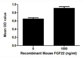 FGF22 (Fibroblast growth factor 22) is a member of the fibroblast growth factor (FGF) family. FGF family members possess broad mitogenic and cell survival activities and are involved in a variety of biological processes including embryonic development, cell growth, morphogenesis, tissue repair, tumor growth and invasion. A proliferation assay was conducted to detect the bioactivity of recombinant mouse FGF22 using 3T3 cells. Briefly, 3T3 cells were seeded into triplicate wells of 96-well plates at a density of 2,000 cells/well and allowed to attach overnight, then the medium was replaced with serum-free standard DMEM prior to the addition of various concentrations of FGF22. After incubated for 48h, cells were observed by inverted microscope and cell proliferation was measured by Cell Counting Kit-8 (CCK-8). Briefly, 10µL of CCK-8 solution was added to each well of the plate, then the absorbance at 450nm was measured using a microplate reader after incubating the plate for 1-4 hours at 37°C. Proliferation of 3T3 cells after incubation with FGF22 for 48h observed by inverted microscope was shown. Cell viability was assessed by CCK-8 (Cell Counting Kit-8 ) assay after incubation with recombinant FGF22 for 48h. The result was shown. It was obvious that FGF22 significantly increased cell viability of 3T3 cells. |
