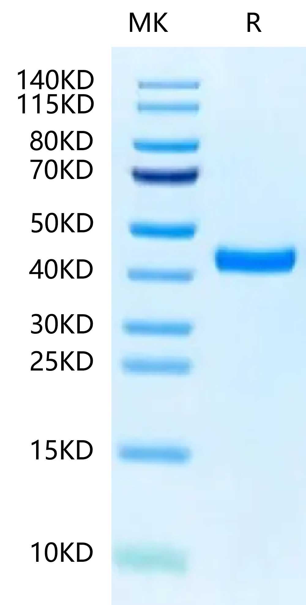 | Molecular Mass : | The protein has a predicted MW of 31.48 kDa. Due to glycosylation, the protein migrates to 40-50 kDa based on Tris-Bis PAGE result. |