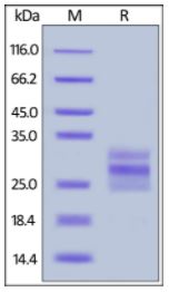 | Molecular Mass : | The protein has a calculated MW of 20.2 kDa. The protein migrates as 25-33 kDa under reducing (R) condition (SDS-PAGE) due to glycosylation. |