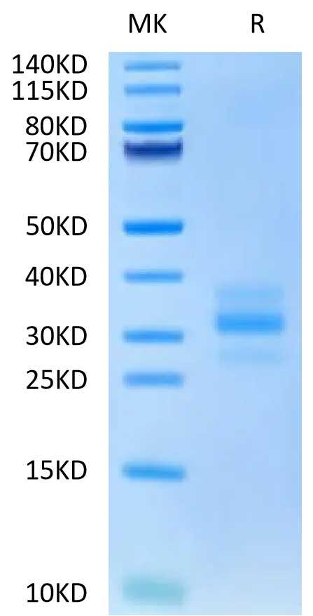 Molecular Mass : | The protein has a predicted MW of 19.61 kDa. Due to glycosylation, the protein migrates to 28-38 kDa based on Tris-Bis PAGE result. |
