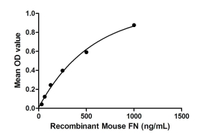 | Bio-activity : | Fibronectin (FN) is a high-molecular weight (~440kDa) glycoprotein of the extracellular matrix that binds to membrane-spanning receptor proteins called integrins. Fibronectins bind cell surfaces and various compounds including collagen, fibrin, heparin, DNA, and actin. Fibronectin has numerous functions. For example, it involved in cell adhesion, cell motility, opsonization, wound healing, maintenance of cell shape, and so on. Besides, Decorin (DCN) has been identified as an interactor of FN, thus a binding ELISA assay was conducted to detect the interaction of recombinant mouse FN and recombinant mouse DCN. Briefly, FN were diluted serially in PBS, with 0.01% BSA (pH 7.4). Duplicate samples of 100μL were then transferred to DCN-coated microtiter wells and incubated for 2h at 37°C. Wells were washed with PBST and incubated for 1h with anti-FN pAb, then aspirated and washed 3 times. After incubation with HRP labelled secondary antibody, wells were aspirated and washed 3 times. With the addition of substrate solution, wells were incubated 15-25 minutes at 37°C. Finally, add 50µL stop solution to the wells and read at 450nm immediately. The binding activity of FN and DCN was shown, and this effect was in a dose dependent manner. |