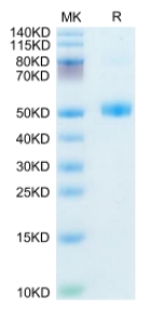 | Molecular Mass : | The protein has a predicted MW of 39.2 kDa. Due to glycosylation, the protein migrates to 50-60 kDa based on Tris-Bis PAGE result. |