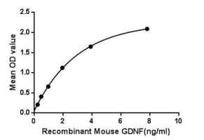 Glial cell-derived neurotrophic factor (GDNF) is a small protein that potently promotes the survival of many types of neurons. This protein was shown to promote the survival and differentiation of dopaminergic neurons in culture, and was able to prevent apoptosis of motor neurons induced by axotomy. The most prominent feature of GDNF is its ability to support the survival of dopaminergic and motorneurons. Besides, Glial Cell Line Derived Neurotrophic Factor Receptor Alpha 2 (GFRa2) has been identified as an interactor of GDNF, thus a binding ELISA assay was conducted to detect the interaction of recombinant mouse GDNF and recombinant mouse GFRa2. Briefly, GDNF were diluted serially in PBS, with 0.01% BSA (pH 7.4). Duplicate samples of 100uL were then transferred to GFRa2-coated microtiter wells and incubated for 2h at 37°C. Wells were washed with PBST and incubated for 1h with anti-GDNF pAb, then aspirated and washed 3 times. After incubation with HRP labelled secondary antibody, wells were aspirated and washed 3 times. With the addition of substrate solution, wells were incubated 15-25 minutes at 37°C. Finally, add 50µL stop solution to the wells and read at 450nm immediately. The binding activity of GDNF and GFRa2 was shown, and this effect was in a dose dependent manner. |