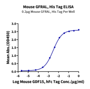 | Bio-activity : | Immobilized Mouse GFRAL, His Tag at 2 ug/ml (100 ul/well) on the plate. Dose response curve for Mouse GDF15, hFc Tag with the EC50 of 3.0 ng/ml determined by ELISA. |