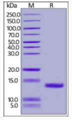 | Molecular Mass : | The protein has a calculated MW of 10.9 kDa. The protein migrates as 14 kDa under reducing (R) condition (SDS-PAGE) due to glycosylation. |