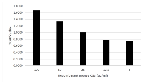 Complement Component 5a (C5a) is a component of the complement system which plays a key role in promoting migration and adherence of neutrophils and monocytes to vessel walls. The activity of recombinant mouse C5a was also measured by its ability to induce N-acetyl-β-D-glucosaminidase release from differentiated U937 human histiocytic lymphoma cells. 3.2*10^6 differentiated U937 cells were added to the 24-well plate and different concentrations of rmC5a was added to the 24-well plate and incubated at 37°C for 3min. The cells were centrifuged at 400 g for 3min, and the supernatant contained N-acetyl-β-D-glucosaminidase. The enzyme activity of N-acetyl-β-D-glucosaminidase was measured by the substrate of 4-Nitrophenyl 2-acetamido-2-deoxy-β-D-glucopyranoside. It was obvious that rmC5a can significantly induce N-acetyl-β-D-glucosaminidase release. |