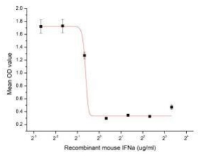 Interferon-alpha (IFNa), also known as leukocyte interferon, represents a group of related but distinct proteins that share over 95% amino acid sequence homology. They are members of the type I interferon family which share a common cell surface receptor composed of two subunits. IFN-α has both anti-viral and immunomodulatory activities on target cells. To test the effect of IFNa on cell apoptosis, A549 cells were seeded into triplicate wells of 96-well plates at a density of 4,000 cells/well and allowed to attach overnight, then the medium was replaced with various concentrations of recombinant mouse IFNa diluted with 5% serum standard DMEM. After incubated for 72h, cells were observed by inverted microscope and cell proliferation was measured by Cell Counting Kit-8 (CCK-8). Briefly, 10 µl of CCK-8 solution was added to each well of the plate, then the absorbance at 450 nm was measured using a microplate reader after incubating the plate for 1-4 hours at 37°C. Apoptosis of A549 cells after incubation with IFNa for 72h observed by inverted microscope was shown. Cell viability was assessed by CCK-8 (Cell Counting Kit-8 ) assay after incubation with recombinant mouse IFNa for 72h. It was obvious that IFNa significantly decreased cell viability of A549 cells. The ED50 of recombinant mouse IFNa is 0.65 ug/ml. |