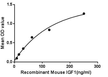 Insulin-like growth factor 1 (IGF1), also called somatomedin C is a hormone similar in molecular structure to insulin. It plays an important role in childhood growth and continues to have anabolic effects in adults. A synthetic analog of IGF1, mecasermin, is used for the treatment of growth failure. Besides, Insulin Like Growth Factor Binding Protein 3 (IGFBP3) has been identified as an interactor of IGF1, thus a binding ELISA assay was conducted to detect the interaction of recombinant mouse IGF1 and recombinant mouse IGFBP3. Briefly, IGF1 were diluted serially in PBS, with 0.01% BSA (pH 7.4). Duplicate samples of 100μL were then transferred to IGFBP3-coated microtiter wells and incubated for 2h at 37°C. Wells were washed with PBST and incubated for 1h with anti-IGF1 pAb, then aspirated and washed 3 times. After incubation with HRP labelled secondary antibody, wells were aspirated and washed 3 times. With the addition of substrate solution, wells were incubated 15-25 minutes at 37°C. Finally, add 50µL stop solution to the wells and read at 450nm immediately. The binding activity of IGF1 and IGFBP3 was shown, and this effect was in a dose dependent manner. |