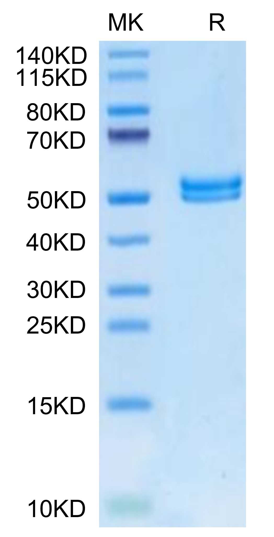 | Molecular Mass : | The protein has a predicted MW of 39.19 kDa. Due to glycosylation, the protein migrates to 48-58 kDa based on Tris-Bis PAGE result. |
