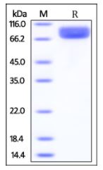 Molecular Mass : | The protein has a calculated MW of 62.7 kDa. The protein migrates as 67-100 kDa under reducing (R) condition (SDS-PAGE) due to glycosylation. |