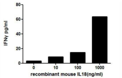 | Bio-activity : | IL18 (interleukin 18) is a cytokine that shares similarities in structure with IL1, and is produced by macrophages and other cells. IL18 has been reported to stimulate T cells proliferation and NK cell activity, besides, murine IL18 has been found to enchance the production of INFγ in spleen cells in vitro. Thus, a stimulation assay was conducted to detect the activity of IL18 using murine spleen cells. Briefly, murine spleen cells were seeded into wells of 6-well plates at a density of 2×10^6 cells/mL in RPMI-1640 with the addition of various concentrations of IL18. After incubation for 48 hours, the concentration of INFγ in the cell supernatant was detected using an ELISA kit. INFγ levels in the cell supernatant of spleen cells increased significantly after stimulated with IL18. |