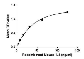 | Bio-activity : | The interleukin 4 (IL4) is a cytokine that induces differentiation of naive helper T cells (Th0 cells) to Th2 cells. Upon activation by IL4, Th2 cells subsequently produce additional IL4 in a positive feedback loop. IL4 has many biological roles, including the stimulation of activated B-cell and T-cell proliferation, and the differentiation of B cells into plasma cells. It is a key regulator in humoral and adaptive immunity. IL4 induces B-cell class switching to IgE, and up-regulates MHC class II production. IL4 decreases the production of Th1 cells, macrophages, IFN-gamma, and dendritic cell IL12. Besides, Interleukin 2 Receptor Gamma (IL2Rg) has been identified as an interactor of IL4, thus a binding ELISA assay was conducted to detect the interaction of recombinant mouse IL4 and recombinant mouse IL2Rg. Briefly, IL4 were diluted serially in PBS, with 0.01% BSA (pH 7.4). Duplicate samples of 100μL were then transferred to IL2Rg-coated microtiter wells and incubated for 2h at 37°C. Wells were washed with PBST and incubated for 1h with anti-IL4 pAb, then aspirated and washed 3 times. After incubation with HRP labelled secondary antibody, wells were aspirated and washed 3 times. With the addition of substrate solution, wells were incubated 15-25 minutes at 37°C. Finally, add 50µL stop solution to the wells and read at 450nm immediately. The binding activity of IL4 and IL2Rg was shown, and this effect was in a dose dependent manner. |