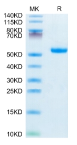 Molecular Mass : | The protein has a predicted MW of 37.7 kDa. Due to glycosylation, the protein migrates to 50-60 kDa based on Tris-Bis PAGE result. |