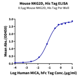 | Bio-activity : | Immobilized Mouse NKG2D, His Tag at 5ug/ml (100ul/well) on the plate. Dose response curve for Human MICA, hFc Tag with the EC50 of 71.3ng/ml determined by ELISA. |