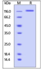 | Molecular Mass : | The protein has a calculated MW of 86.2 kDa. The protein migrates as 120 kDa under reducing (R) condition (SDS-PAGE) due to glycosylation. |