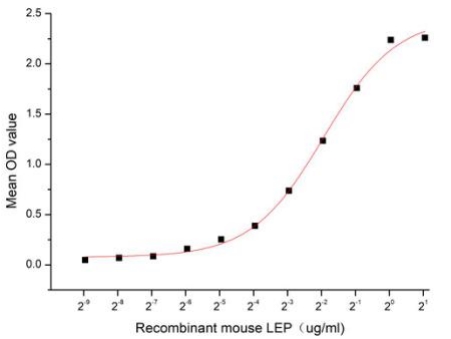 Leptin is a hormone made by adipose cells that helps to regulate energy balance by inhibiting hunger. Many of leptin's effects are mediated through neuropeptide-containing neurons and neuropeptide receptors in the hypothalamus. Although regulation of fat stores is deemed to be the primary function of leptin, it also plays a role in other physiological processes, as evidenced by its multiple sites of synthesis other than fat cells, and the multiple cell types beside hypothalamic cells that have leptin receptors. A functional binding ELISA assay was conducted to detect the interaction of recombinant mouse LEP and recombinant human LEPR. Briefly, LEP were diluted serially in PBS, with 0.01% BSA (pH 7.4). Duplicate samples of 100 ul were then transferred to LEPR-coated microtiter wells and incubated for 2h at 37°C. Wells were washed with PBST and incubated for 1h with anti-LEP pAb, then aspirated and washed 3 times. After incubation with HRP labelled secondary antibody, wells were aspirated and washed 3 times. With the addition of substrate solution, wells were incubated 15-25 minutes at 37°C. Finally, add 50 µL stop solution to the wells and read at 450 nm immediately. The binding activity of of LEP and LEPR was shown, the EC50 for this effect is 0.26 ug/mL. |