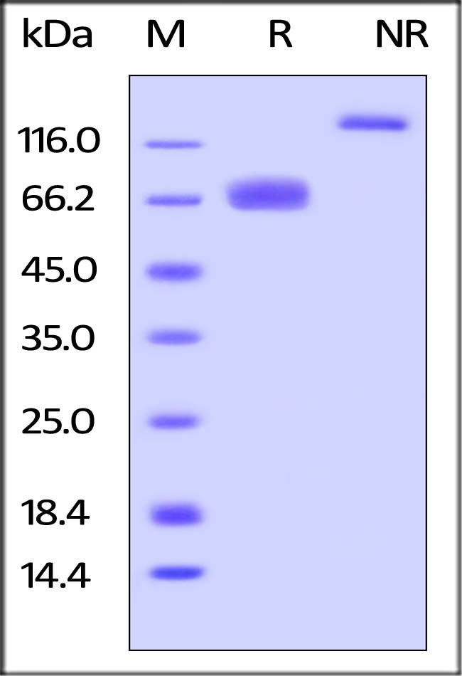 The protein has a calculated MW of 50.7 kDa. As a result of glycosylation, the protein migrates as 60-66 kDa under reducing (R) condition, and 120-140 kDa under non-reducing (NR) condition (SDS-PAGE). |