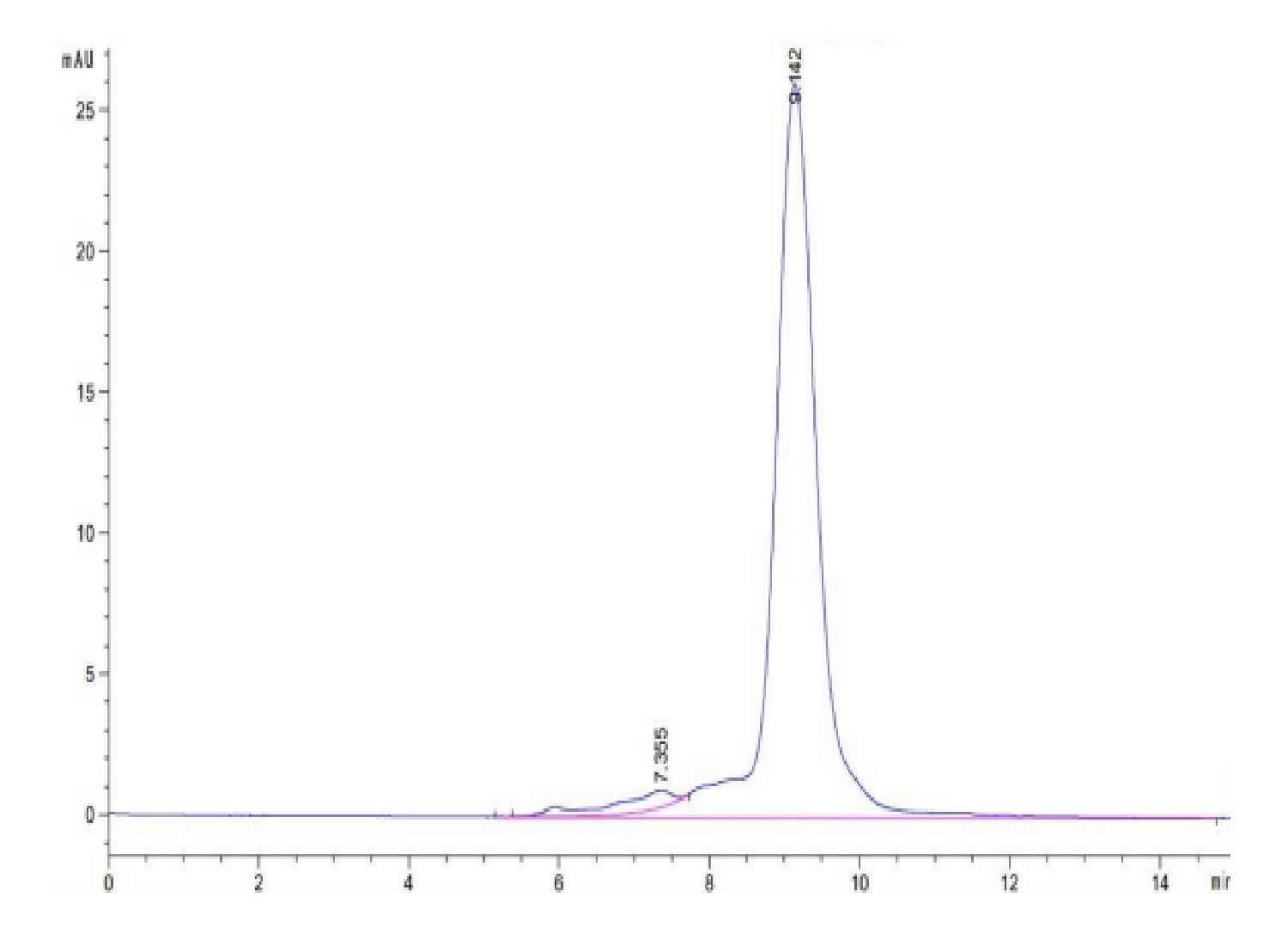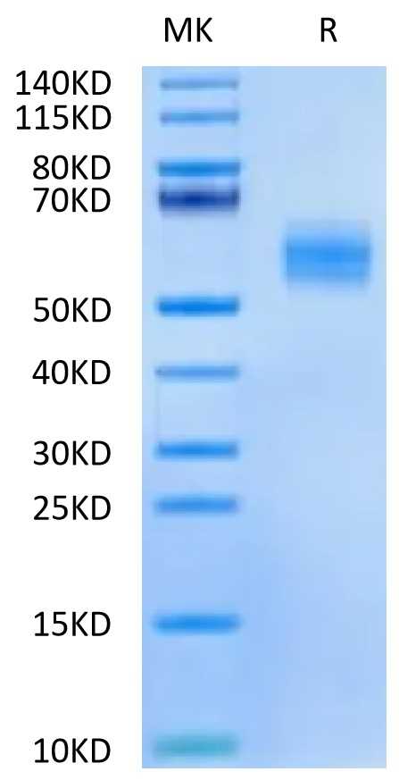 | Molecular Mass : | The protein has a predicted MW of 42.61 kDa. Due to glycosylation, the protein migrates to 50-65 kDa based on Tris-Bis PAGE result. |