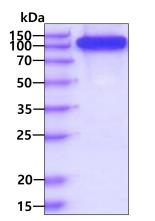 | Description : | Mer, also known as Tyrosine-protein kinase Mer, is one of the receptor tyrosine kinase that transduces signals from the extracellular matrix into the cytoplasm. It regulates many physiological processes including cell survival, migration, differentiation, and phagocytosis of apoptotic cells. This protein plays a role in various processes such as macrophage clearance of apoptotic cells, platelet aggregation, cytoskeleton reorganization and engulfment. Mutations in this protein have been associated with disruption of the retinal pigment epithelium (RPE) phagocytosis pathway and onset of autosomal recessive retinitis pigmentosa (RP). Recombinant mouse Mer, fused to hIgG-His-tag, was expressed in insect cell and purified by using conventional chromatography techniques. |