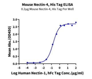 Immobilized Mouse Nectin-4, His Tag at 2ug/ml (100ul/well) on the plate. Dose response curve for Human Nectin-1, hFc Tag with the EC50 of 0.16ug/ml determined by ELISA. |