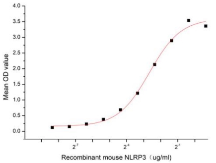 | Bio-activity : | NLR Family, Pyrin Domain Containing Protein 3 (NLRP3), also known as NALP3, CIAS1, PYPAF or Cryopyrin, is a cytosolic multiprotein complex composed of the innate immune receptor protein NLRP3, adapter protein ASC, and inflammatory protease caspase-1 that responds to microbial infection, endogenous danger signals, and environmental stimuli. Aberrant activation of the NLRP3 inflammasome is associated with the pathogenesis of various inflammatory diseases, such as diabetes, cancer, and Alzheimer‘s disease. Interleukin 1 Beta (IL1b) can interact with NLRP3, thus a functional binding ELISA assay was conducted to detect the interaction of recombinant mouse NLRP3 and recombinant chicken IL1b. Briefly, NLRP3 was diluted serially in PBS with 0.01% BSA (pH 7.4). Duplicate samples of 100 μl were then transferred to IL1b-coated microtiter wells and incubated for 1h at 37°C. Wells were washed with PBST and incubated for 1h with anti-NLRP3 pAb, then aspirated and washed 3 times. After incubation with HRP labelled secondary antibody for 1h at 37°C, wells were aspirated and washed 5 times. With the addition of substrate solution, wells were incubated 15-25 minutes at 37°C. Finally, add 50 µL stop solution to the wells and read at 450/630 nm immediately. The binding activity of recombinant mouse NLRP3 and recombinant chicken IL1b was shown, the EC50 for this effect is 0.16 ug/mL. |