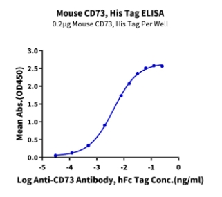 | Bio-activity : | Immobilized Mouse CD73, His Tag at 2 μg/ml (100 μl/well) on the plate. Dose response curve for Anti-CD73 Antibody, hFc Tag with the EC50 of 4.1 ng/ml determined by ELISA. |