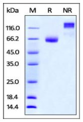 | Molecular Mass : | The protein has a calculated MW of 49.2 kDa. As a result of glycosylation, the protein migrates as 60-70 kDa under reducing (R) condition, and 120-140 kDa under non-reducing (NR) condition (SDS-PAGE). |